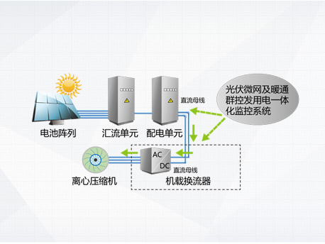 光伏發(fā)電系統(tǒng)不發(fā)電,主機向電網(wǎng)取電運行,機組相當(dāng)于常規(guī)高效變頻離心機。 |