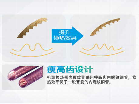 TURBO-B蒸發(fā)管,制冷劑在管路內(nèi)壁形成液膜,針對(duì)不同傳熱機(jī)理、流體介質(zhì)設(shè)計(jì)的特殊換熱表面,提高了殼管換熱效果,同時(shí)降低沿程流動(dòng)壓力損失,減小機(jī)組能耗。